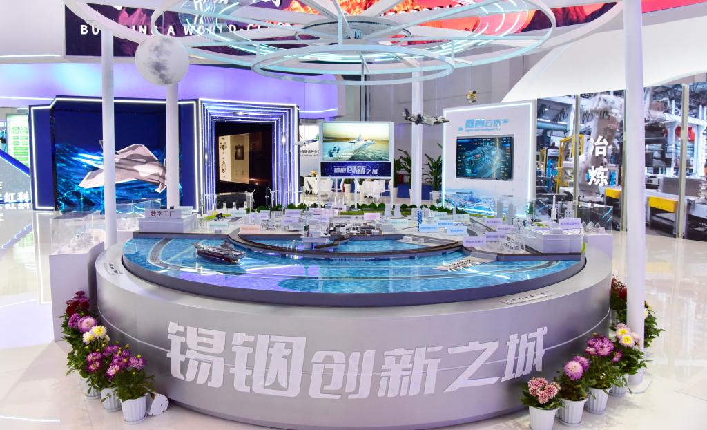 航母、衛(wèi)星、智能機(jī)器人……裸眼3D折角屏以極具視覺震撼的特效,生動展示錫基、銦基合金在大國重器制造中的應(yīng)用,成為制造業(yè)館的靚麗打卡點(diǎn)。