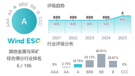 近日,萬得(Wind)更新了2025年最新ESG評(píng)級(jí)結(jié)果,錫業(yè)股份Wind ESG評(píng)級(jí)由過去連續(xù)4年的BBB級(jí)首次提升至A級(jí),在金屬與采礦行業(yè)186家納評(píng)上市公司中目前排名第6(AA和A評(píng)級(jí)分別僅占2%和10%,目前暫無AAA評(píng)級(jí)企業(yè))。在此次評(píng)級(jí)中,錫業(yè)股份ESG綜合得分為7.91分,在環(huán)境、社會(huì)、治理三個(gè)維度得分分別為6.95、8.27、5.77,均處于行業(yè)前列。