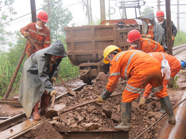 老廠分公司紅塘子鐵道運(yùn)輸線路是馬鹿塘坑出礦的主要運(yùn)輸線路,承擔(dān)著80%的礦量運(yùn)輸任務(wù)。8月3日,由于連續(xù)多日強(qiáng)降雨,老廠分公司紅塘子鐵道運(yùn)輸線路段出現(xiàn)局部陷落問題,運(yùn)輸線路生產(chǎn)受阻。對此,敢打硬仗的馬坑干部職工在洪災(zāi)面前不氣餒,困難面前不低頭,以泰山壓頂不彎腰的氣魄與暴雨奮力搏斗,經(jīng)受住了一場特殊的考驗,譜寫了一曲“狂風(fēng)暴雪何所懼,奮力抗災(zāi)保生產(chǎn)”的樂章。